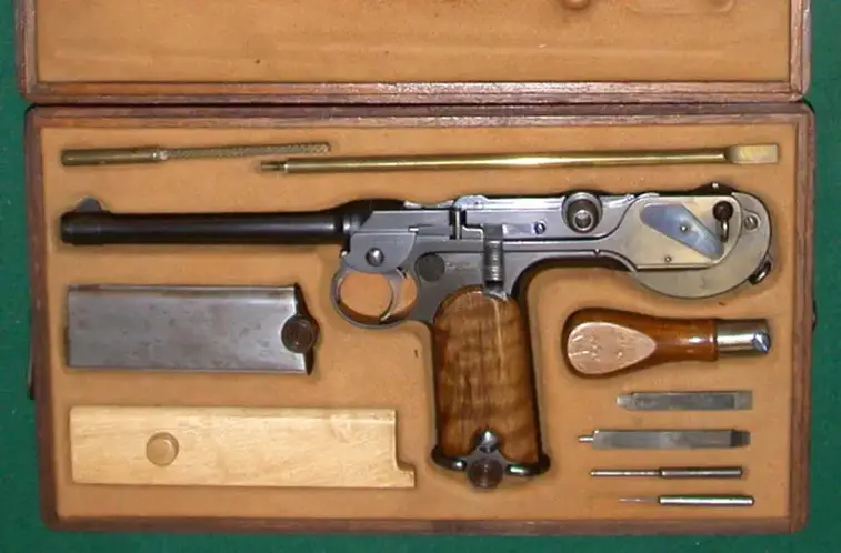 Борхардт К93, разработанный Гуго Борхардтом в 1893 году, стал первым удачным самозарядным пистолетом. Инженер также создал под него оригинальный патрон 7,65 мм Borchardt. Несмотря на хорошие баллистические характеристики и надежность, пистолет оказался громоздким из-за почти вертикальной рукоятки и неравномерного распределения веса.