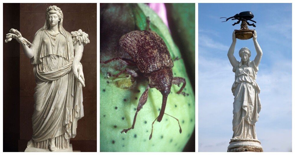 Величественная и прекрасная древнеримская богиня Церера, отвечающая за произрастание злаков, других растений, урожай и плодородие в целом, застыла, воздев руки к небесам. А в ладонях небожительницы гордо восседает неказистое, да ещё и вредное насекомое. Какая связь может быть между совершенно противоположными персонажами?