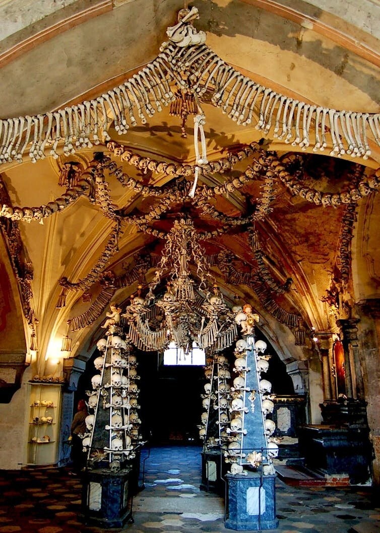 10. Седлецкий склеп или Седлецкая Костница, расположен в небольшом городке Седлек недалеко от Праги. Этот склеп состоит примерно из 40000 скелетов