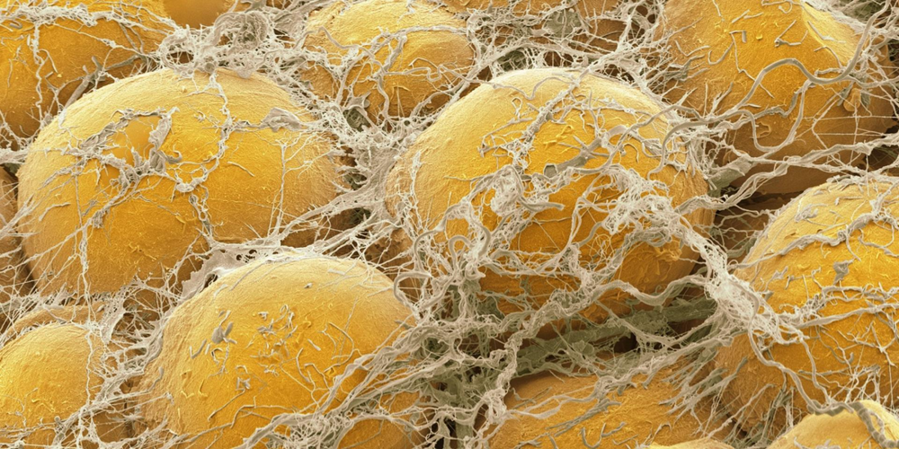 Адипоциты в сеточке из белков. Похоже на авоську с мандаринами.
