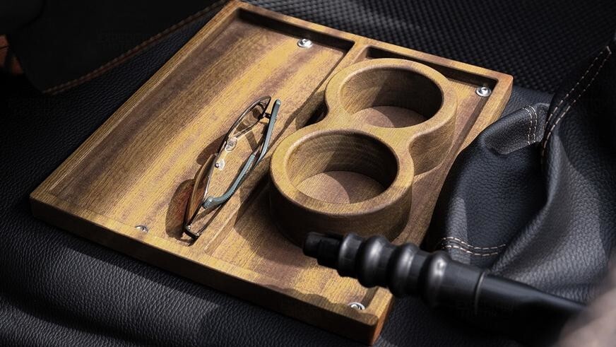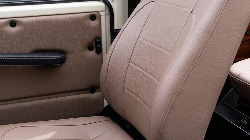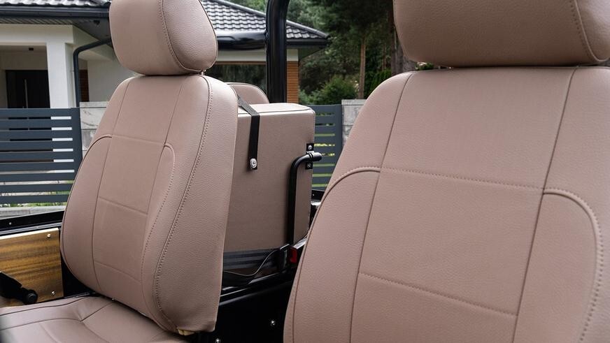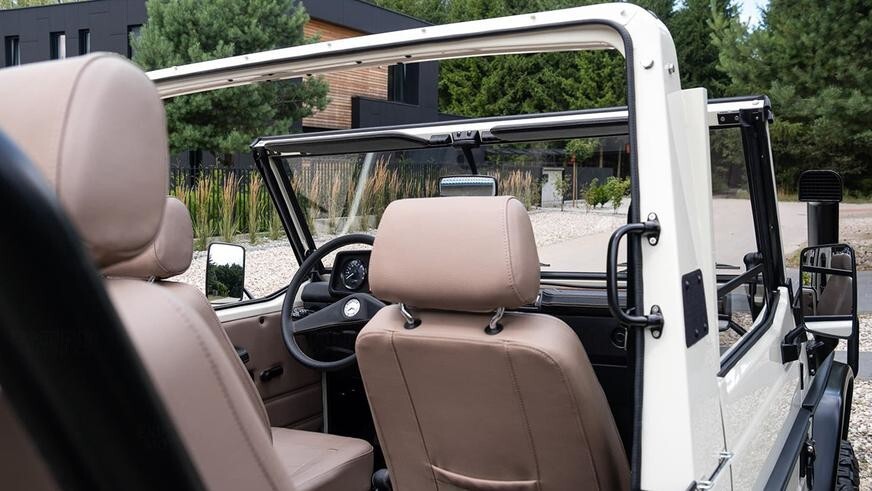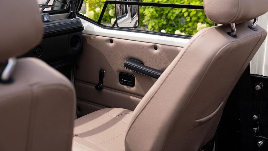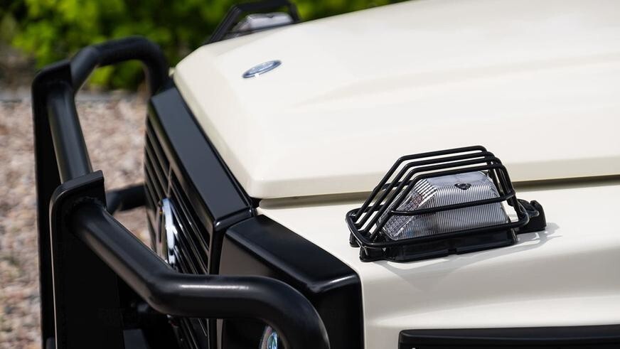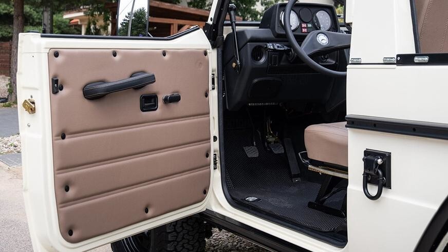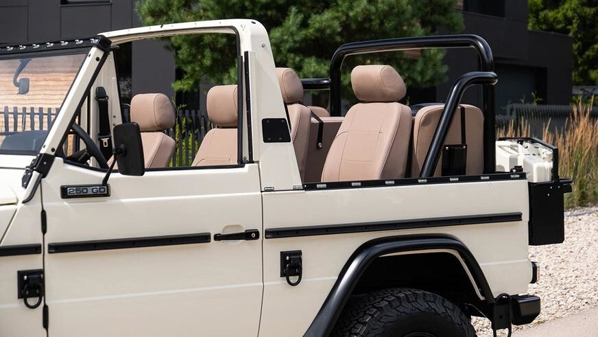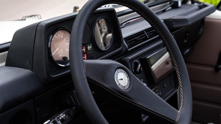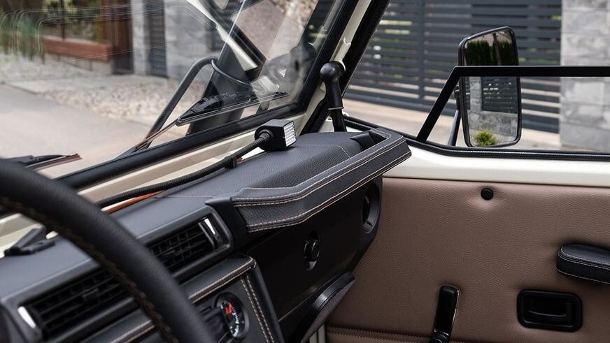 Раму гелика отпескоструили и покрыли антикоррозионной грунтовкой, кузовные панели восстановили и заново покрасили. В итоге G-класс обрёл оригинальный светло-кремовый цвет с чёрными вставками. Контрастными выполнены, к примеру, расширители арок, шноркель, силовой бампер в передней части и защитная дуга сзади. Из нестандартных деталей можно также отметить и массивные боковые петли, подножку и диодную оптику. Салон был перешит бежевой и чёрной кожей, причём ею отделали даже классический двухспицевый руль. В отделке также видны детали из дерева: сопла обдува лобового стекла, ниша с подстаканниками и боковые панели в задней части салона чисто крафтовые изделия. Тюнеры также позаботились о комфорте, добавив подогревы кресел не только спереди, но и сзади.