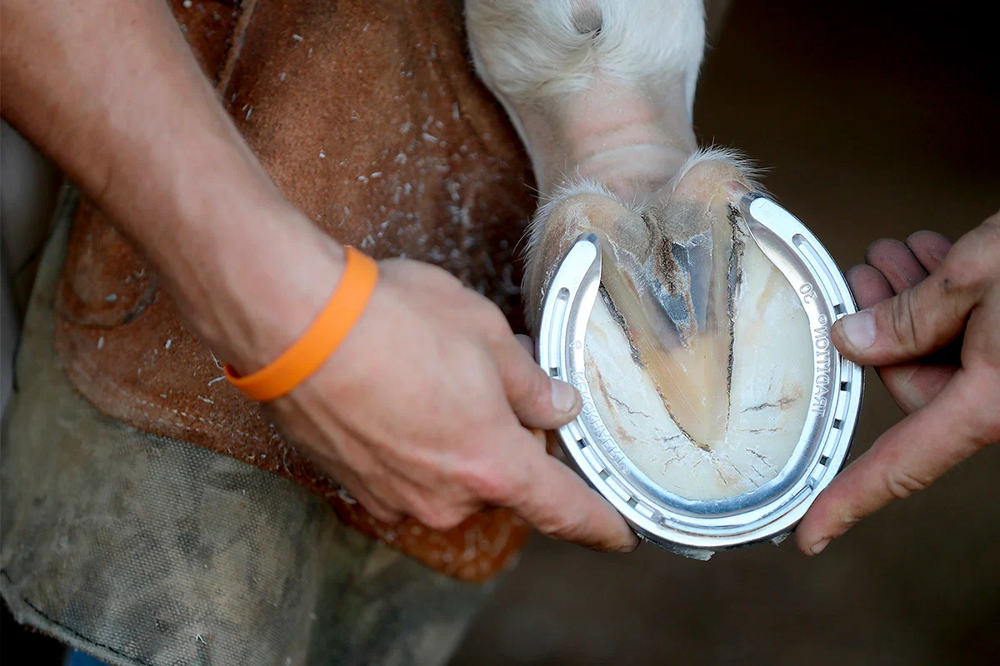 Ответ на частый вопрос: нет, лошади не больно, когда её подковывают. Причём подкова подкове рознь. Обычным коням ставят подковы из низкоуглеродной мягкой стали. А вот тем, кто участвует в соревнованиях кузнецы делают "обувь" полегче - из алюминия.