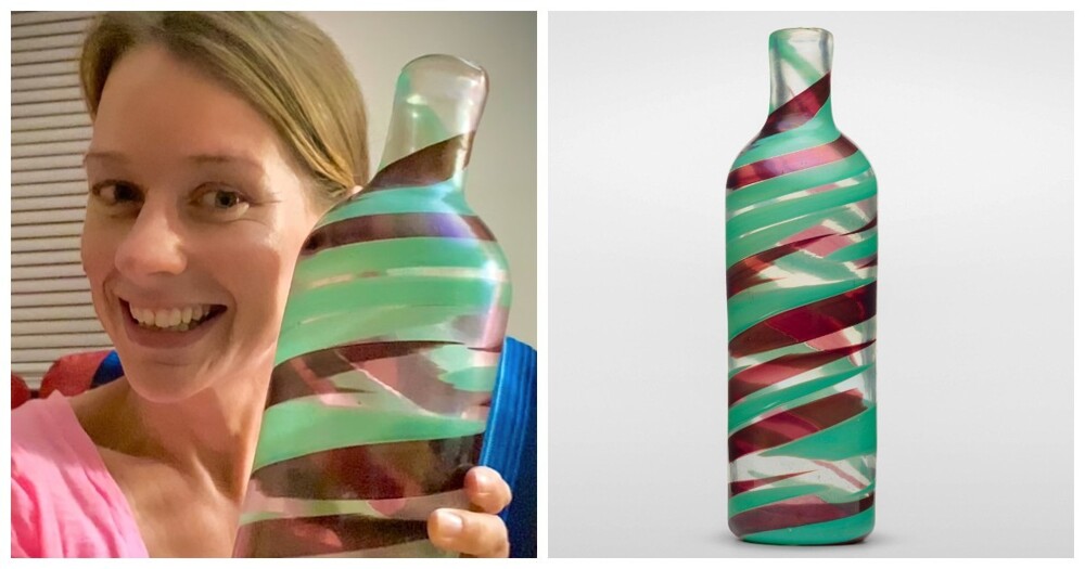 В июне Джессика Винсент проходила по оживленному магазину Goodwill мимо видеомагнитофонов, ламп и стеклянных безделушек. Но ничто не привлекало ее внимания, пока она не увидела вазу в форме бутыли из переливающегося стекла с красноватыми и зелеными полосами. На дне Джессика заметила маленькую букву "М", которая, по ее мнению, обозначала Мурано — остров недалеко от Венеции и историческую родину знаменитого муранского стекла.