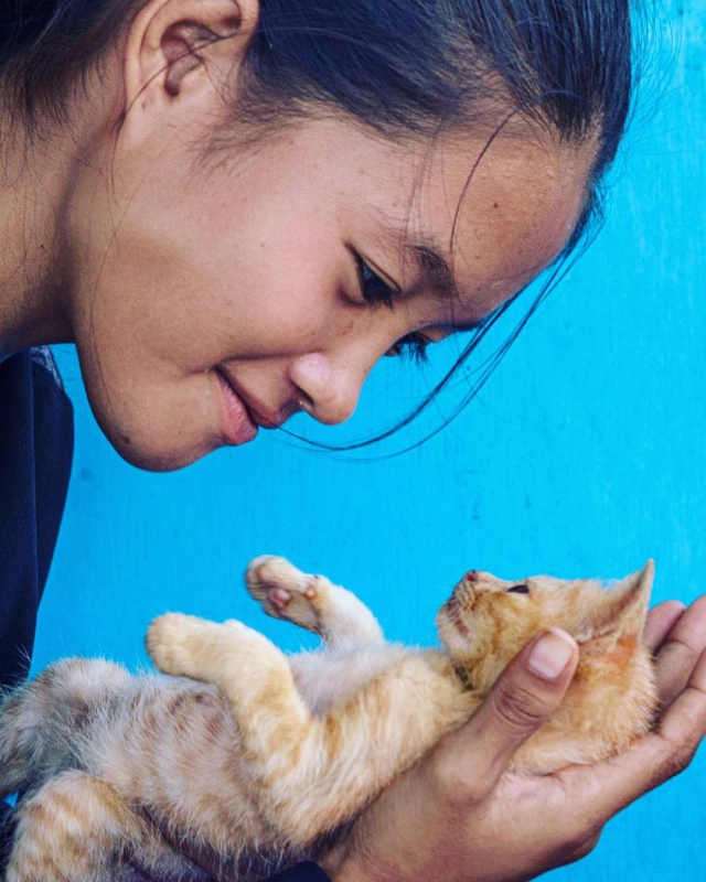 Девочка и котёнок из малайзийского города Семпорна