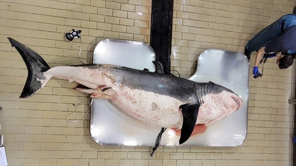 Эту большую белую акулу заметили 5 октября на пляже Брод-Коув в Новой Шотландии, Канада. Сначала она металась по мелководью, а затем загадочным образом оказалась на мели. В итоге акула скончалась, но после этого учёные так и не смогли определить причину смерти.