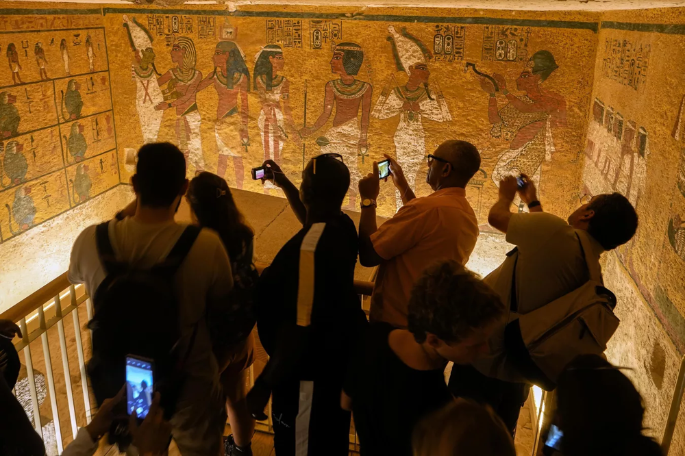 Туристы снимают гробницу царя Тутанхамона в Долине царей в Луксоре, Египет