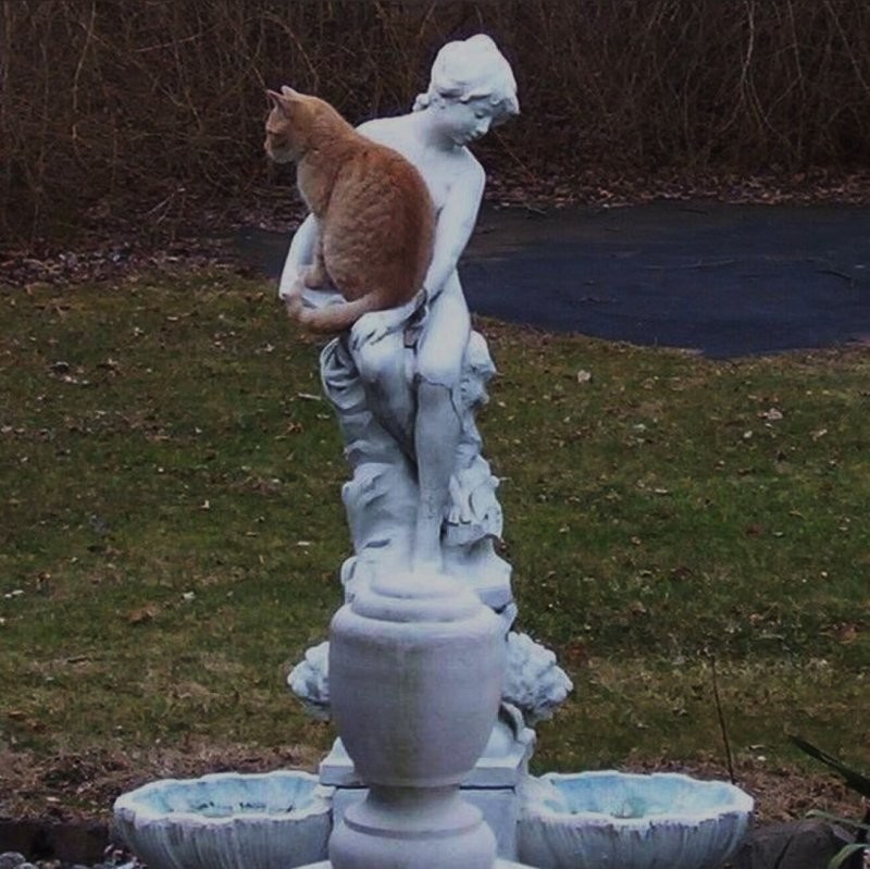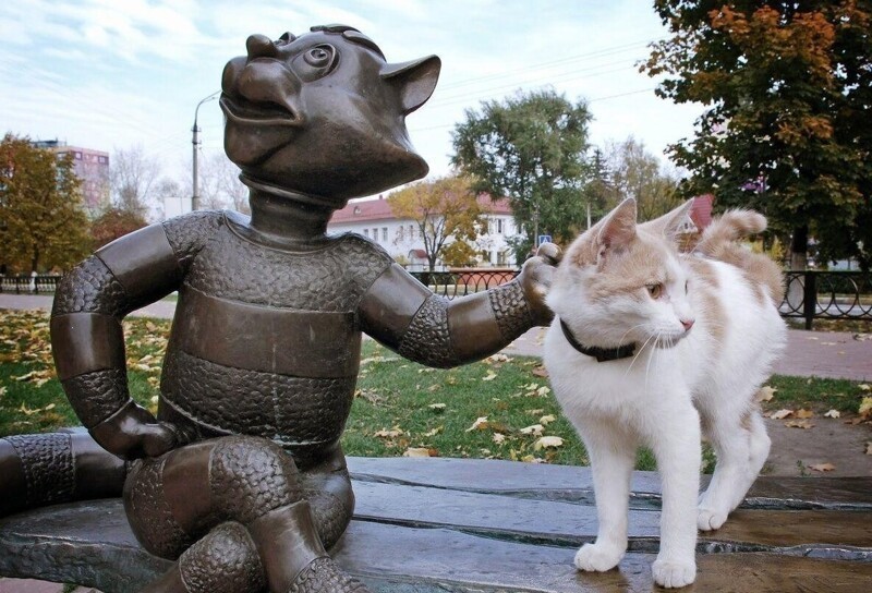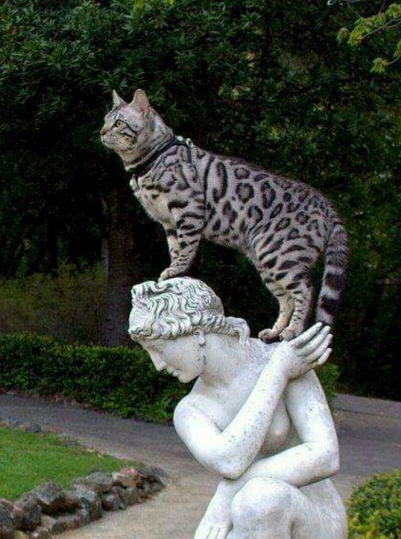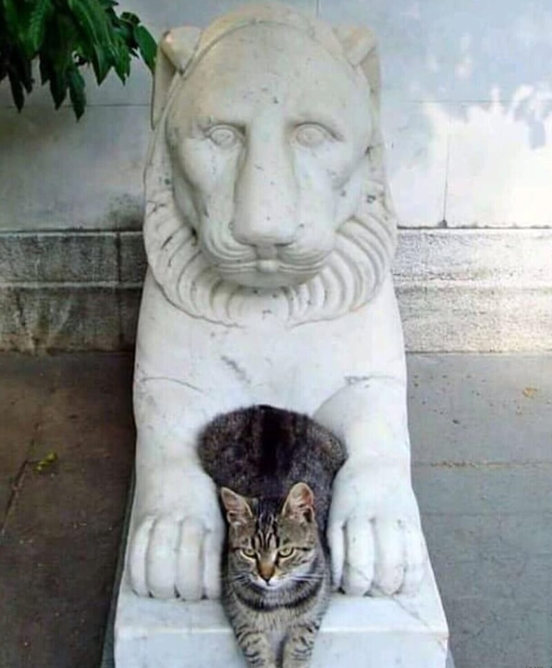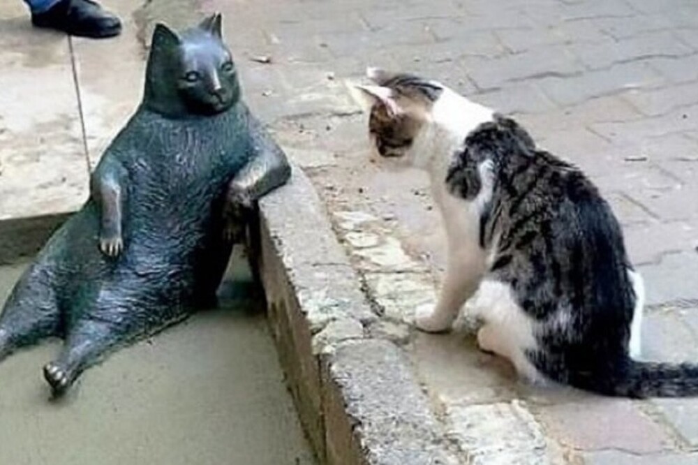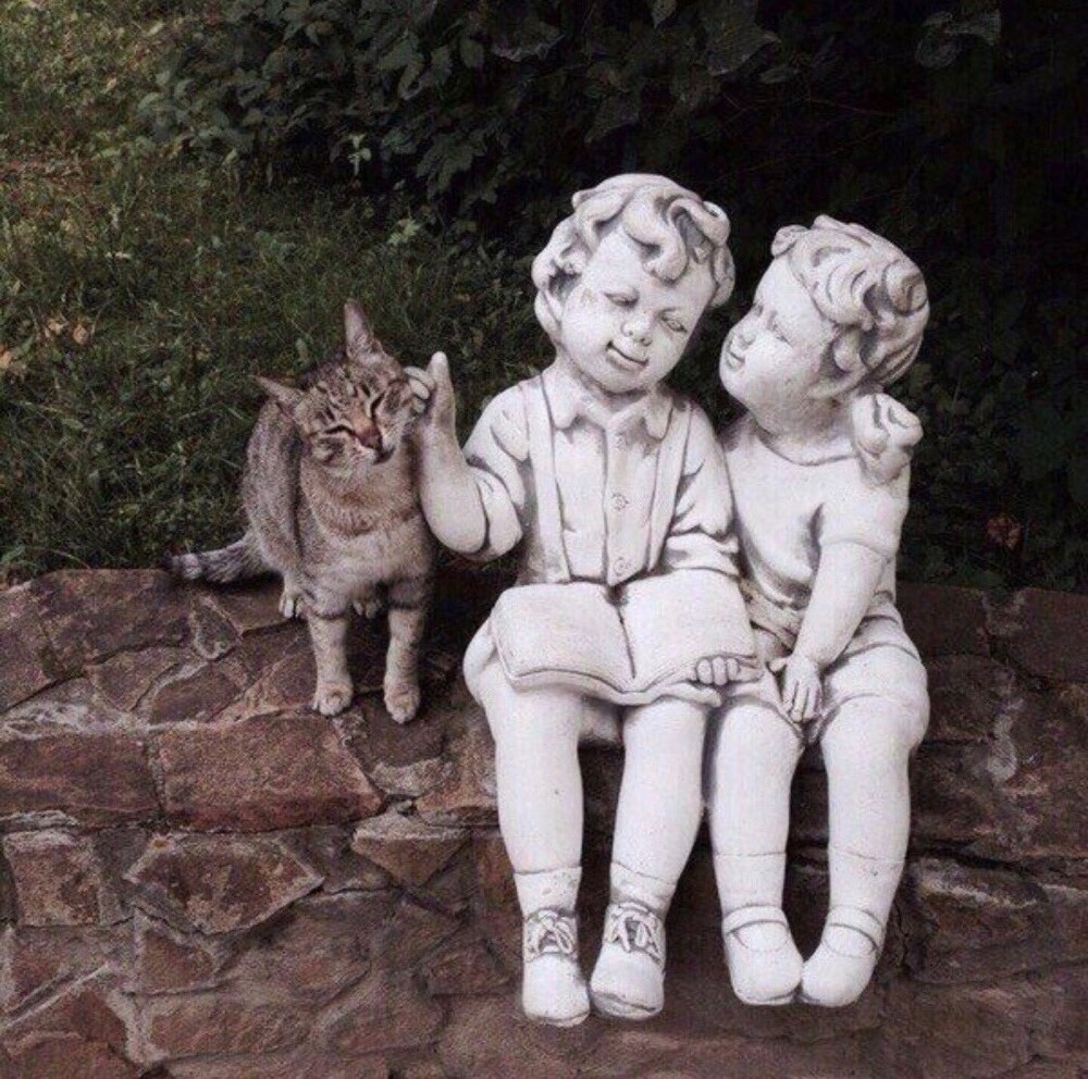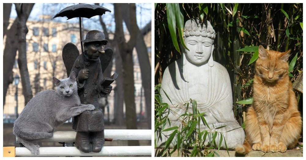 Удачные фото котиков на фоне скульптур и статуй (21 фото)