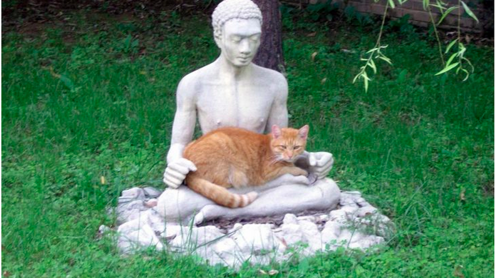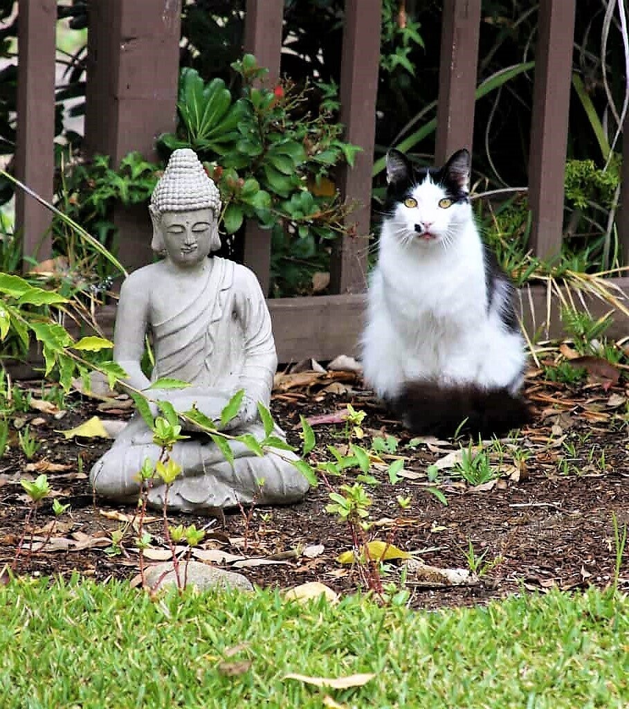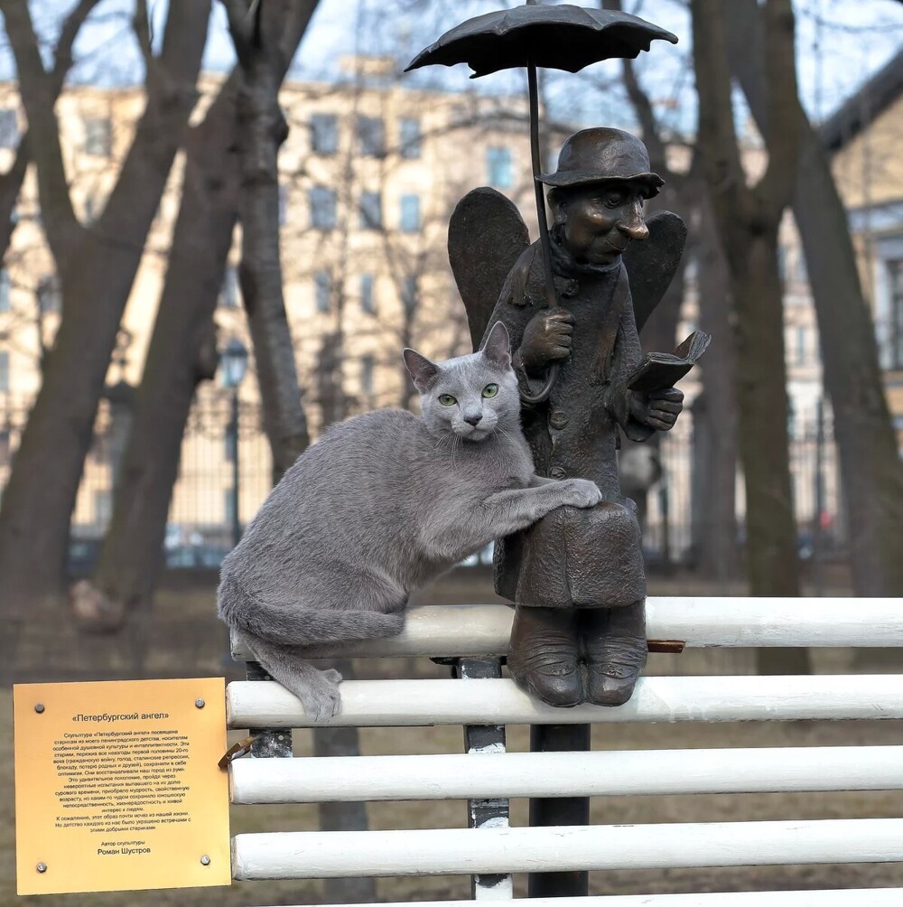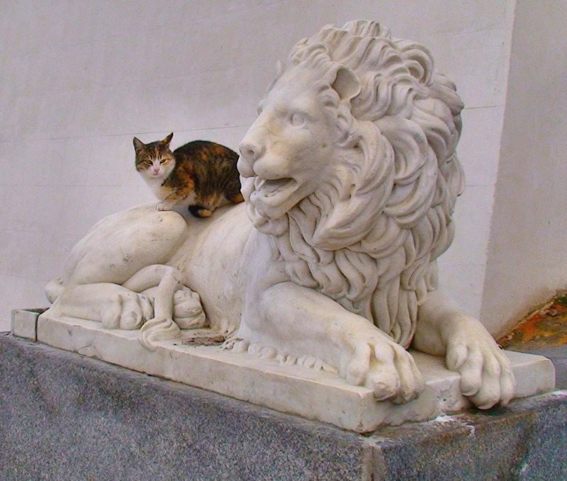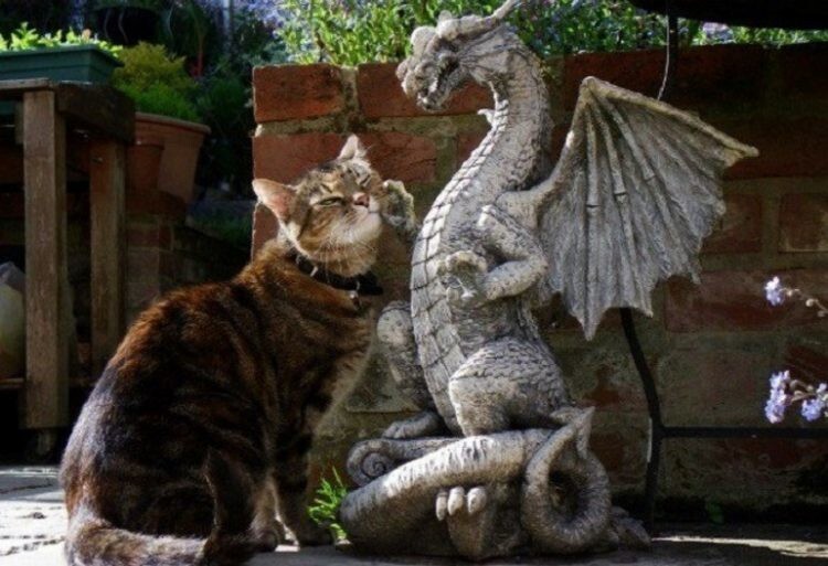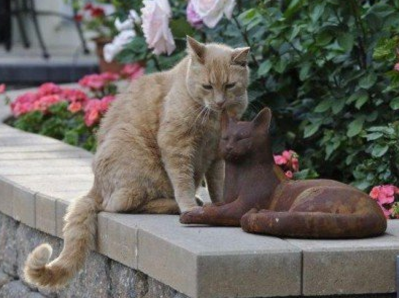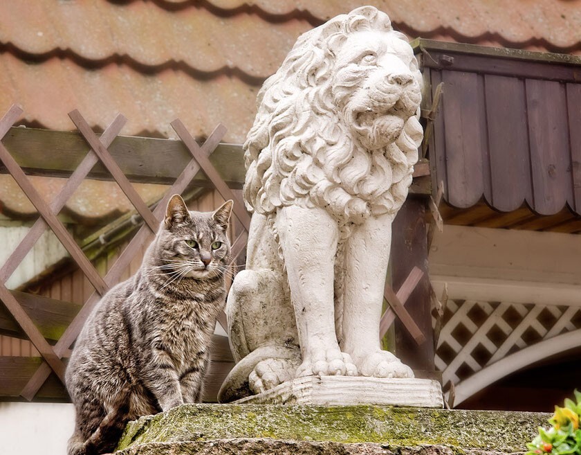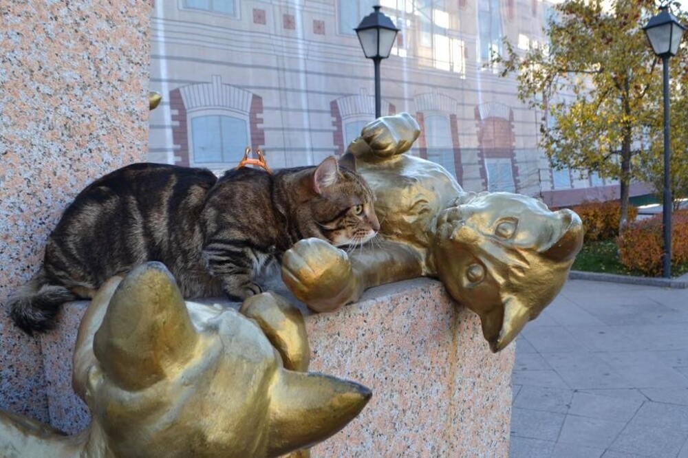 Удачные фото котиков на фоне скульптур и статуй (21 фото)