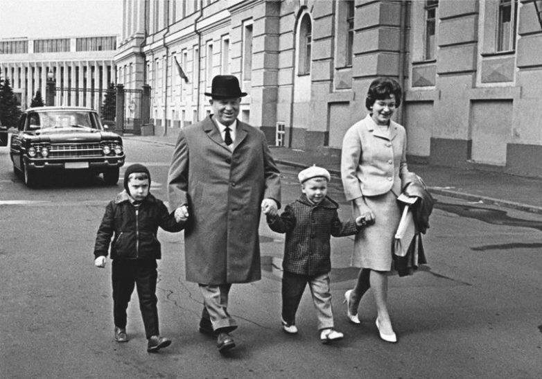 3. Никита Хрущёв с внуками и невесткой идут в магазин, СССР, шестидесятые