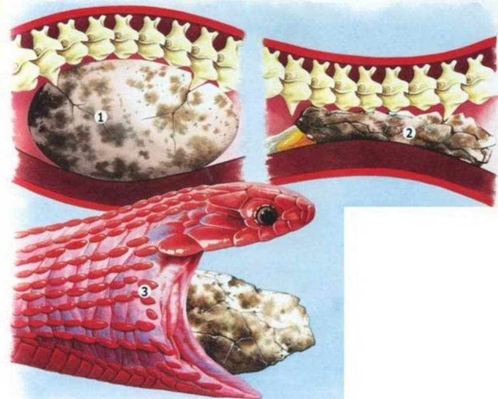 Дайте яичной змейке пару минут покоя, и она проглотит яйцо. Но сам процесс на этом не закончится. Мускулистые мышцы пищевода будут проталкивать яичко глубже, пока оно не наткнётся на... отростки позвоночника? Да, всё верно. Выросты шейных позвонков проникают прямо в пищевод рептилии! Крепкие и острые кости легко пробьют скорлупу, после чего содержимое яйца само потечёт в желудок, а остальное рептилия просто отрыгнёт.