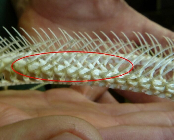 Позвоночник змей. В красном овале – те самые "позвоночниковые" зубы.