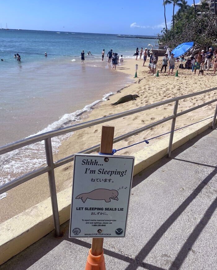 15. Знак предупреждает посетителей пляжа о спящих тюленях. Их просят не беспокоить