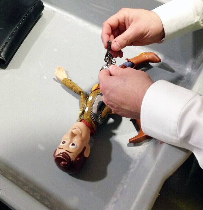 6. "Я путешествую по миру с Вуди из "Истории игрушек", и делаю фото для сына. Сегодня сотрудники аэропорта Лондона конфисковали его оружие"
