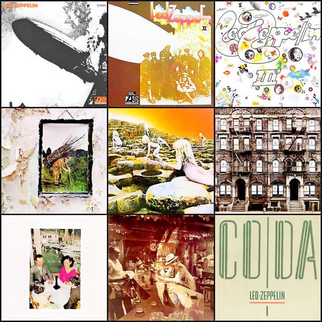 LZ: «Led Zeppelin» (1969), «Led Zeppelin II» (1969), «Led Zeppelin III» (1970), «Led Zeppelin IV» (1971), «Houses of the Holy» (1973), «Physical Graffiti» (1975), «Presence» (1976), «In Through the Out Door» (1979), «Coda» (1982).