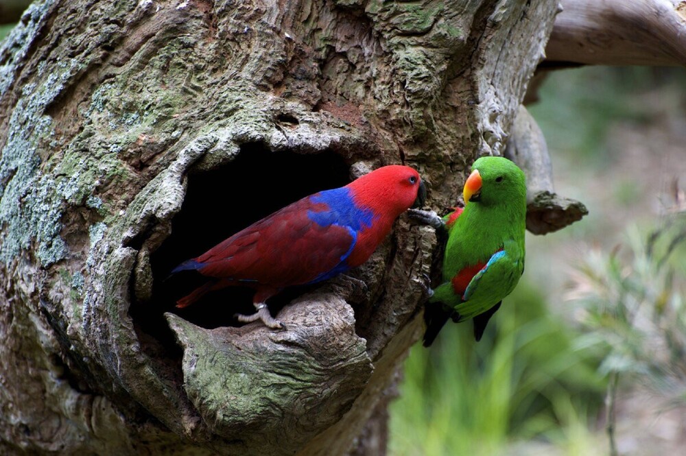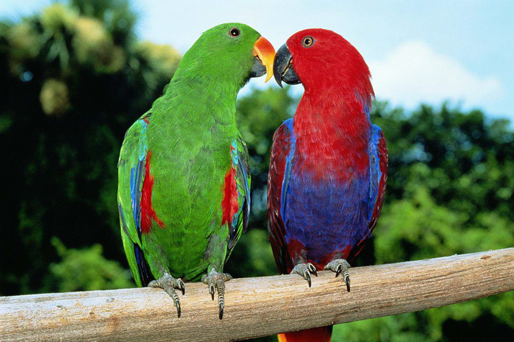 Посмотрите на картинку ниже. Вы бы приняли этих двух попугаев за представителей одного вида? Вот и орнитологи, изучавшие орнитофауну тропических лесов Индонезии, оставили записи, в которых чётко указывали, что встретили два разных вида попугаев. Лишь дальнейшее (и довольно длительное!) наблюдение показало, что перед нами благородный красно-зелёный попугай, чей половой диморфизм дошёл до крайности. Причём яркими и красными у этих попугаев являются самки, а самцы — лишь скромные зелёные трудяжки. Обычно у птиц всё наоборот.