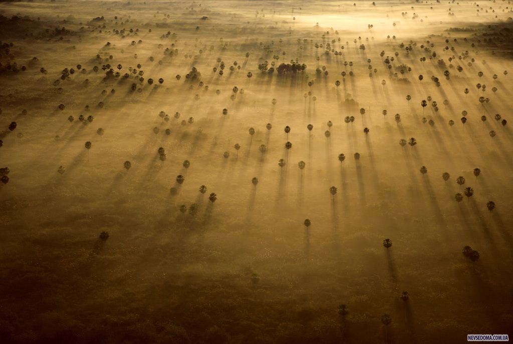 4. Пальмы проступают в утреннем тумане в Пантанале недалеко от Мато Гроссо до Сул, Бразилия. Эта огромная закрытая дельта реки образует экологически разнообразную экосистему на территории Бразилии, Боливии и Парагвая. (Robert B. Haas)