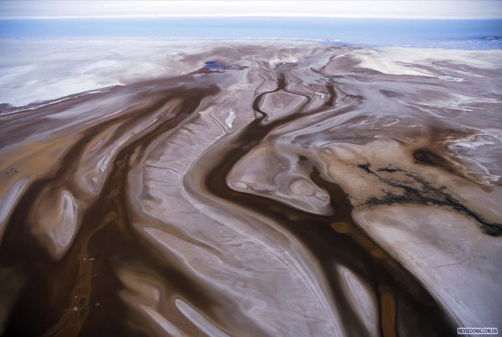 7. Простираясь к голубому соленому озеру, сухие каналы пересекают коричневые массивы Салар де Ууни – крупнейшей в мире соленой равнины. (Robert B. Haas)