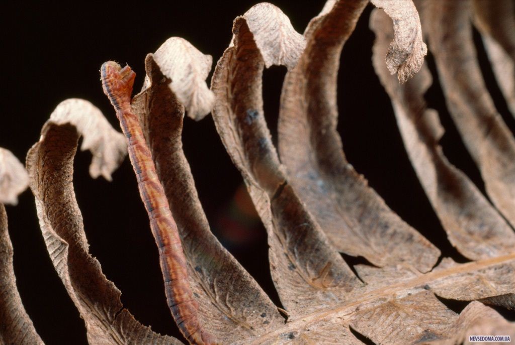 10. Витой лист папоротника предоставляет идеальное укрытие для коричневой пяденицы. Эта гавайская гусеница маскируется, а затем внезапно нападает на своих жертв. (Robert Sisson)