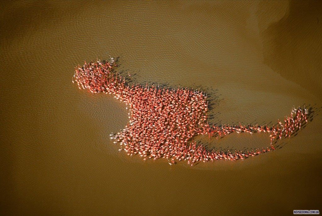 13. Стая фламинго в виде птицы заметно выделяется ярко-розовым пятном в грязных водах лагуны на Мексиканском полуострове Юкатан у побережья Мексиканского залива. (Robert B. Haas)