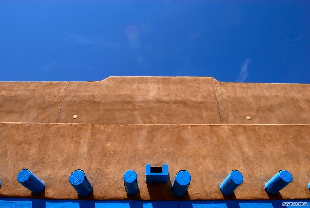 17. Голубое небо и балки обрамляют коричневый глиняный дом в Таосе, Нью-Мехико. Сделанные из самой земли, эти здания обычно строились индейцами. (Raul Touzon)
