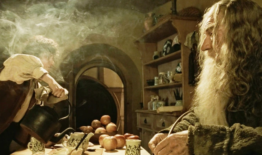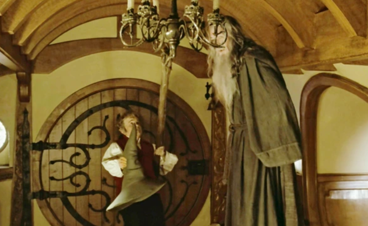 Эту сцену снимали таким образом, чтобы Гендальф сидел ближе к камере, а хоббит находился подальше от нее. Ну а благодаря правильно подобранному ракурсу, зрителям и кажется, что маг гораздо больше полурослика.