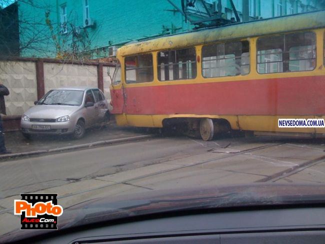 Вчера в Киеве на улице Фрунзе около 13 часов произошла курьезная авария. Из-за плохого качества путей трамвай сошел с рельс, его развернуло и он снес автомобиль с такой скоростью, что несчастный водитель ничего и не понял. Я представляю, как у водителя пронеслась вся жизнь перед глазами, когда он увидел перед собой летящего на него монстра весом 20 тонн. К счастью, люди не пострадали.