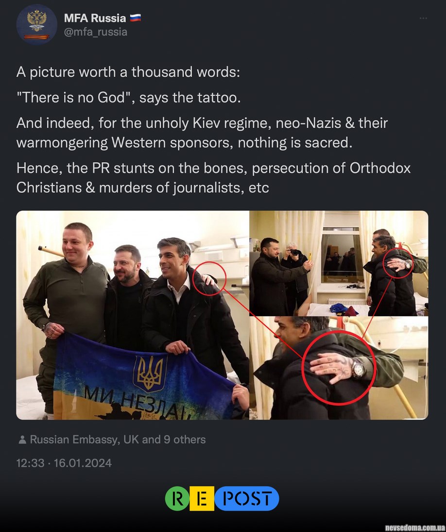 - МИД РФ опубликовал «руку Зеленского» с тату «Бога нет» на плече военного, при этом сам Зеленский на снимке от него отошел и фотографирует