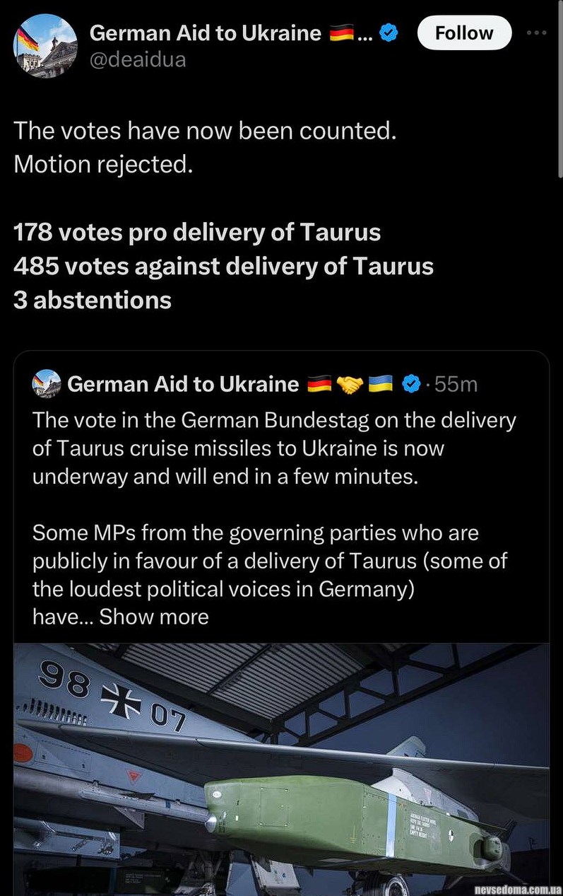 - Бундестаг Германии отказался поставлять Украине крылатые ракеты Taurus.
