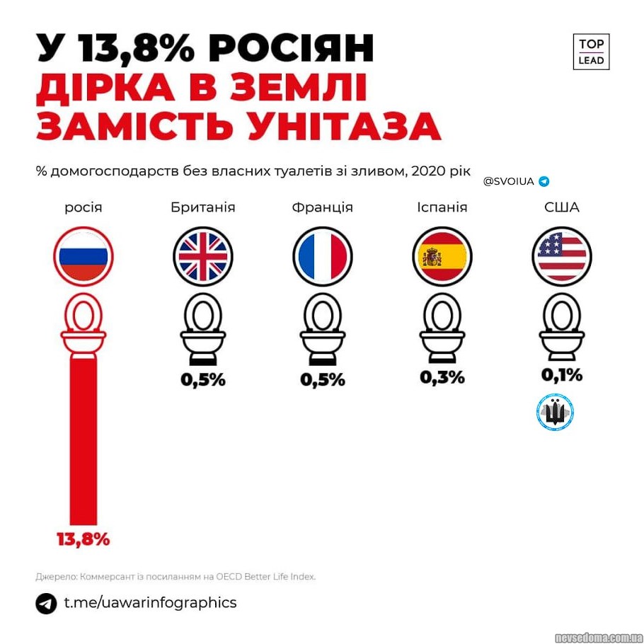 - 14% граждан сверхдержавы не имеют туалета со сливом