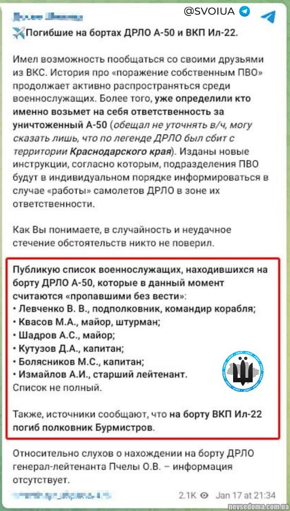 - Российские каналы опубликовали предварительный список лётчиков российских самолётов А-50 и ИЛ-22, которые были демилитаризированы ВСУ