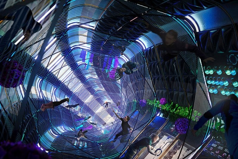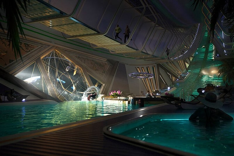 По этой причине он представил роскошные интерьеры с бассейнами и беговыми дорожками. На другом конце троса, на Земле, архитектор создал потрясающий плавучий остров с садами.
