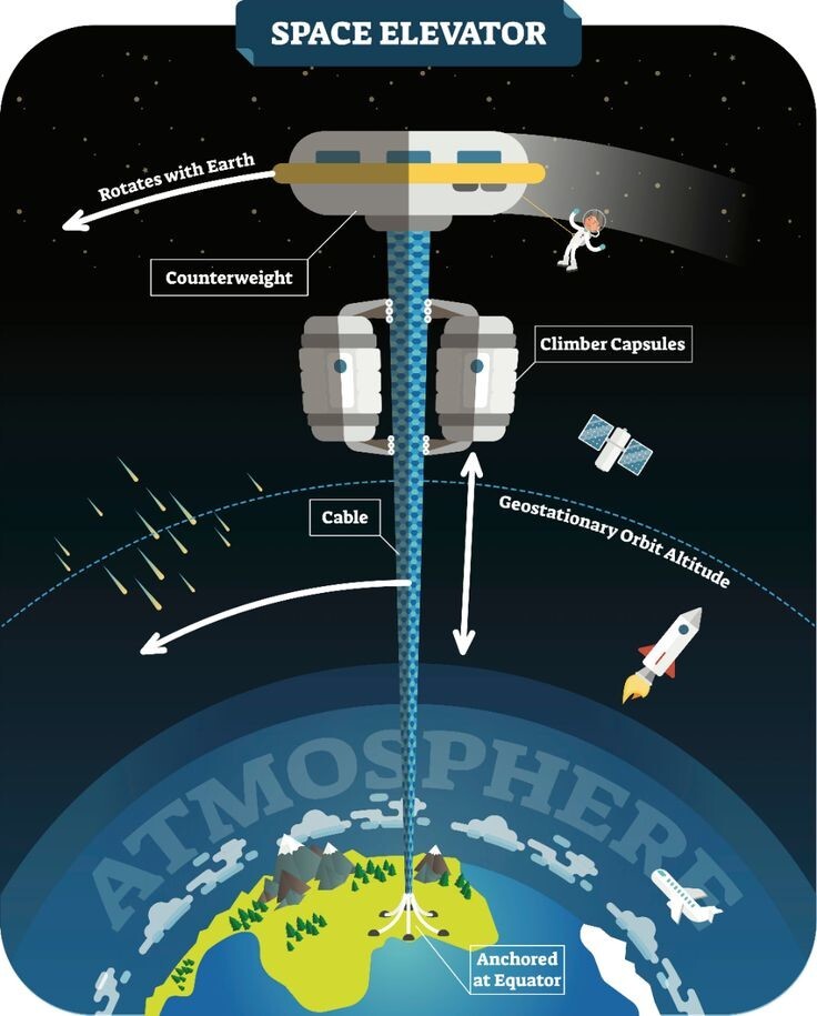 По задумке архитектора, стартовой площадкой станет корабль в океане, который будет соединён особыми тросами с космической станцией. Шесть лифтов (три грузовых и три с иллюминаторами и кислородом для людей) будут курсировать в космос и обратно.
