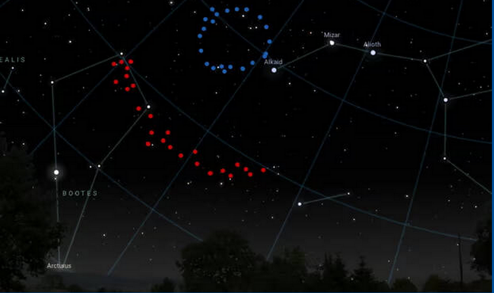 Художественное изображение того, как выглядело бы Большое кольцо (показано синим) и Гигантская дуга (показано красным) на небе, если бы они были видны с Земли. Фото Университета центрального Ланкашира