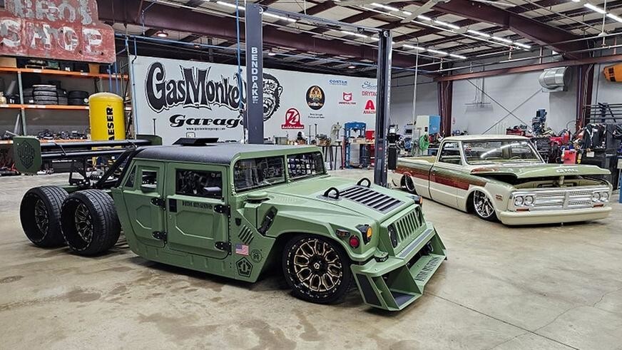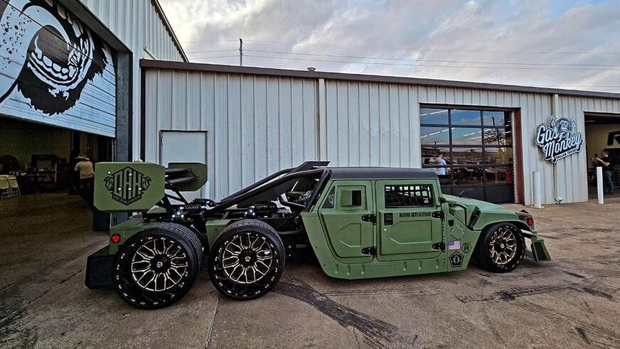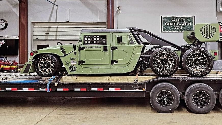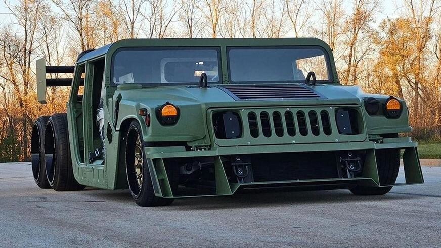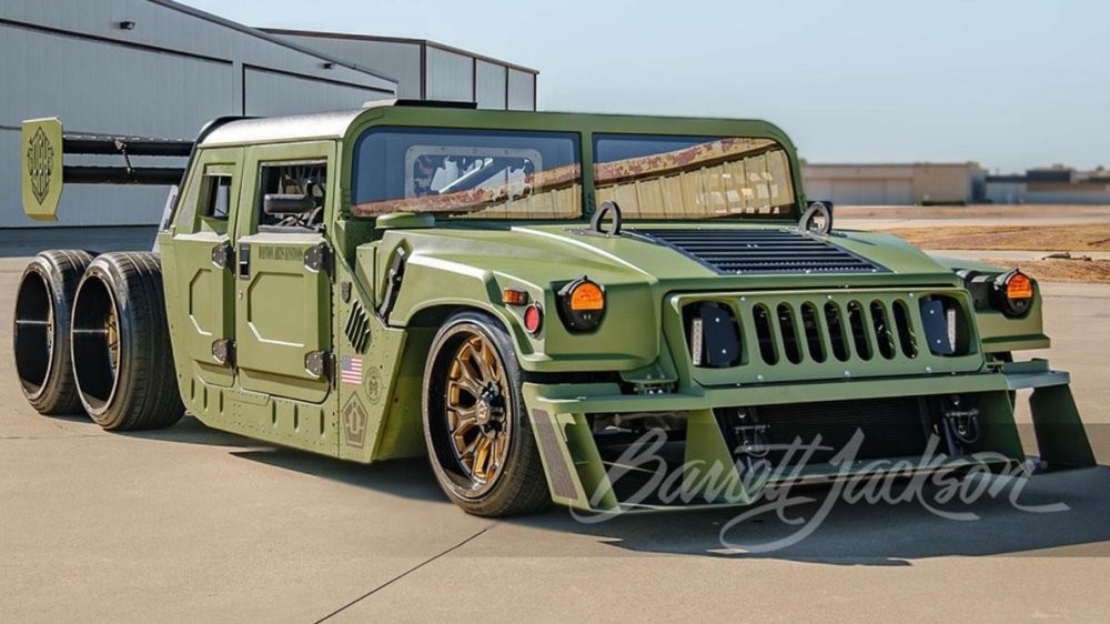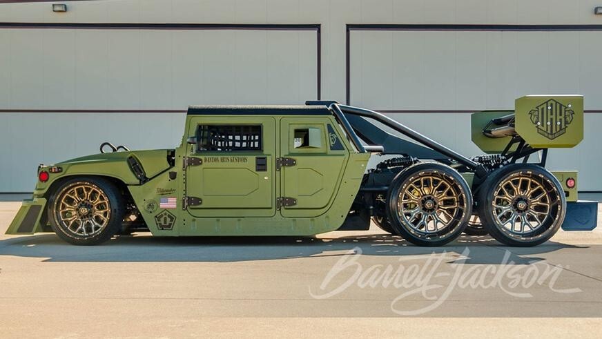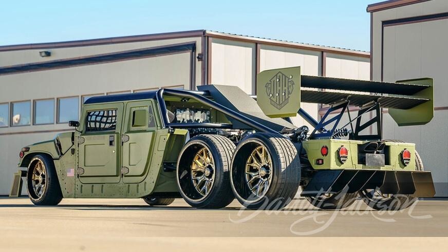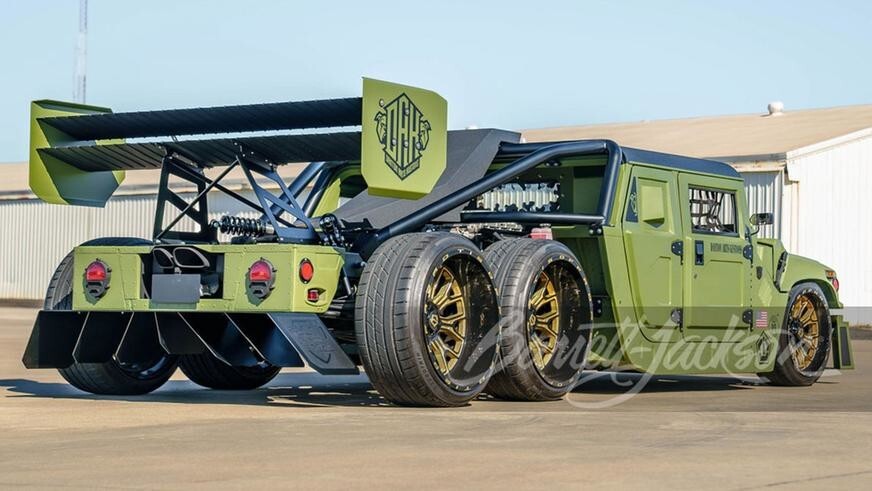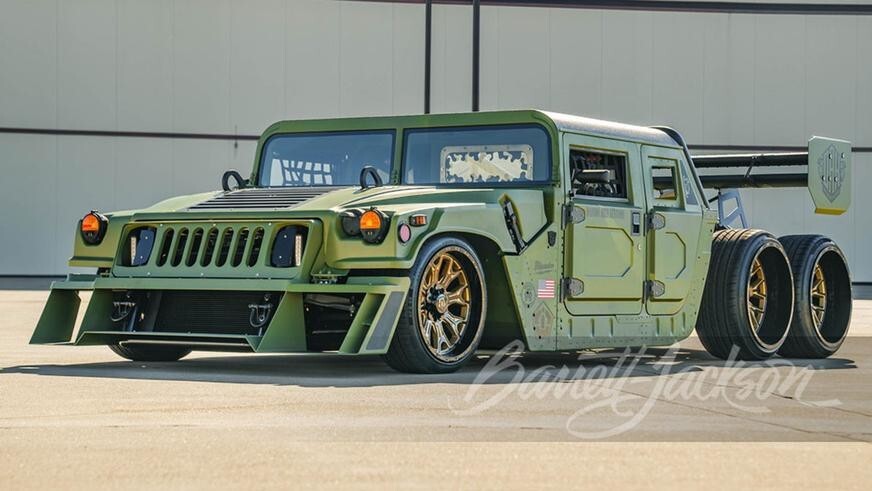 На аукционе Barrett-Jackson в конце января попытаются продать одну из самых странных кастомных машин на базе военного Humvee 2009 года от AM General. Вместо того чтобы доводить до предела его внедорожные возможности, студия Danton Art Kustoms сделала апокалиптичный хот-род с мотором мощностью более 700 сил. Несмотря на шесть колёс и три оси, этот монстр имеет только задний привод.