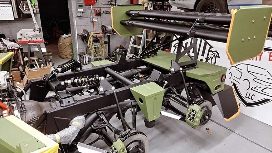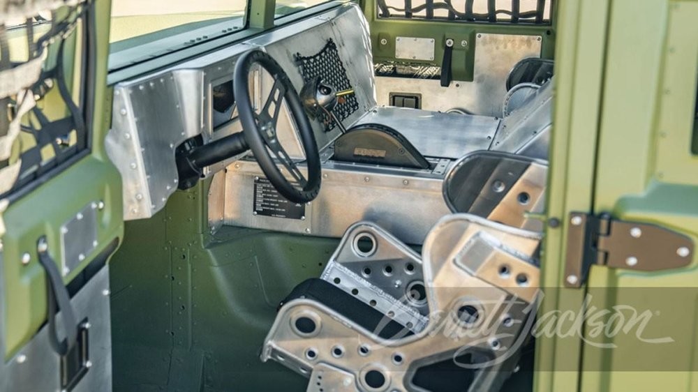 Насколько можно понять из аукционного описания, у военного внедорожника позаимствовали разве что кузов, подвергнув его заметным переделкам: задняя часть укорочена, хотя кастомайзеры сохранили боковые двери, а крыша заметно опущена.