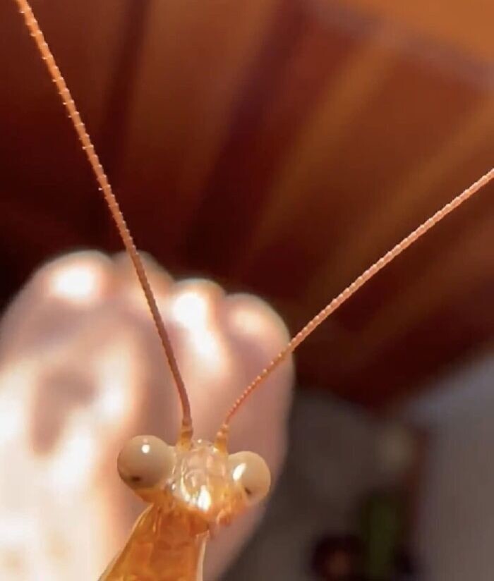 9. «Скриншот из видео, которое я снял вчера. У меня на руке сидел богомол, потом он взлетел и приземлился на мой телефон, и начался хаос. Но я не могу забыть это лицо»
