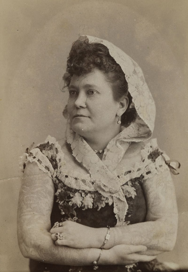 В течение 1890-х годов экзотичная модель гастролировала в основном с цирком Барнума и Бейли. Поначалу на выступлениях эксплуатировалась душещипательная история, в соответствии с которой картины на теле она получила насильственным путём.