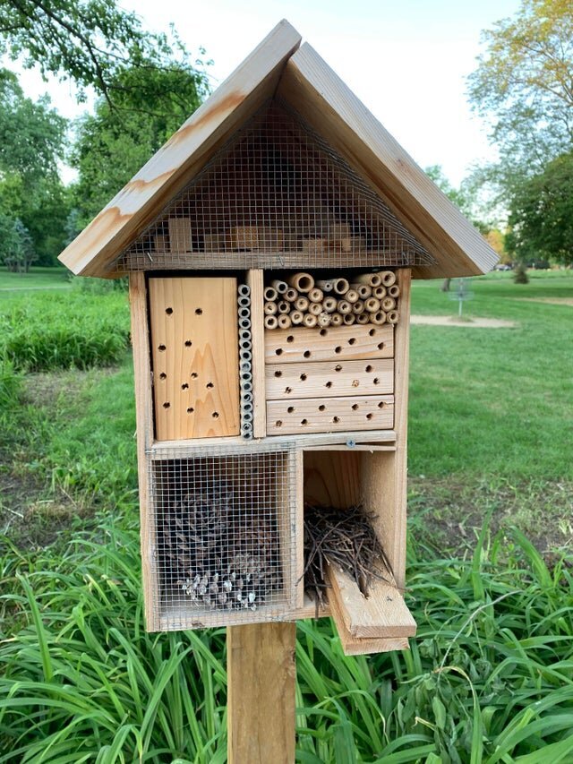 Это дом для пчёл и жуков, он заполнен различными материалами для того, чтобы насекомые могли там перезимовать.