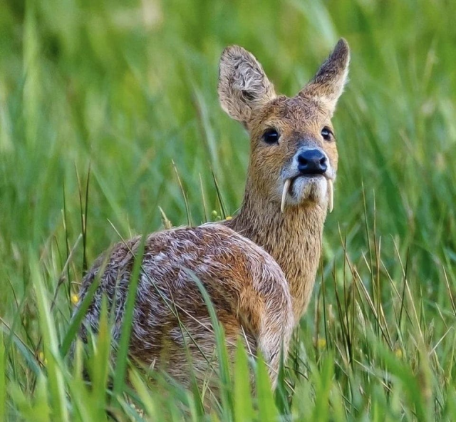 Этот олень-вампир питается исключительно растительной пищей. Его чудо-клыки используется в стычках с другими оленями и животными.