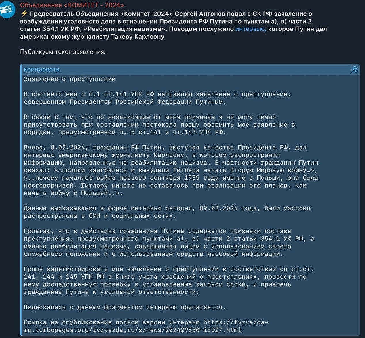 Поводом послужило высказывание Путина в интервью Такеру Карлсону, в котором он фактически оправдал Гитлера за нападение на Польшу.