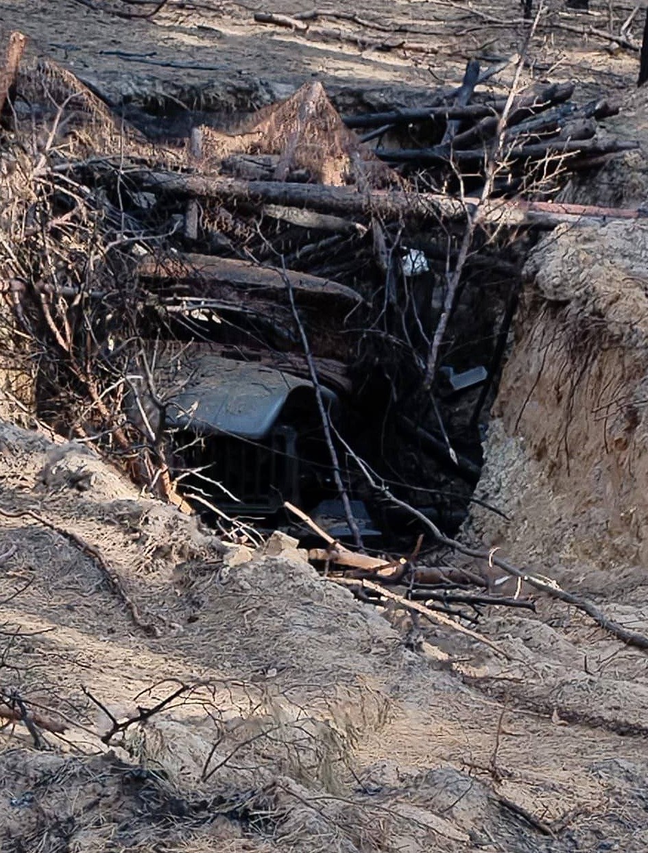 Российские военные пытаются скрыть свою технику, закапывая ее в землю, но это бесполезно, так как украинский дрон типа «Баба Яга», все равно уничтожает ее.