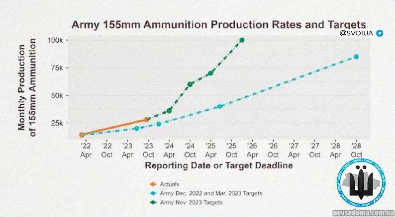 В настоящее время ежедневно производится около 30 тысяч 155-мм артиллерийских снарядов, по сравнению с 14 тысячами до начала вторжения РФ. Согласно данным издания, Украина выпускает около 2 тысяч снарядов в день, в то время как Россия — 10 тысяч.