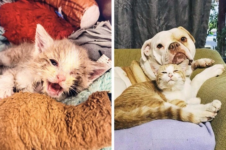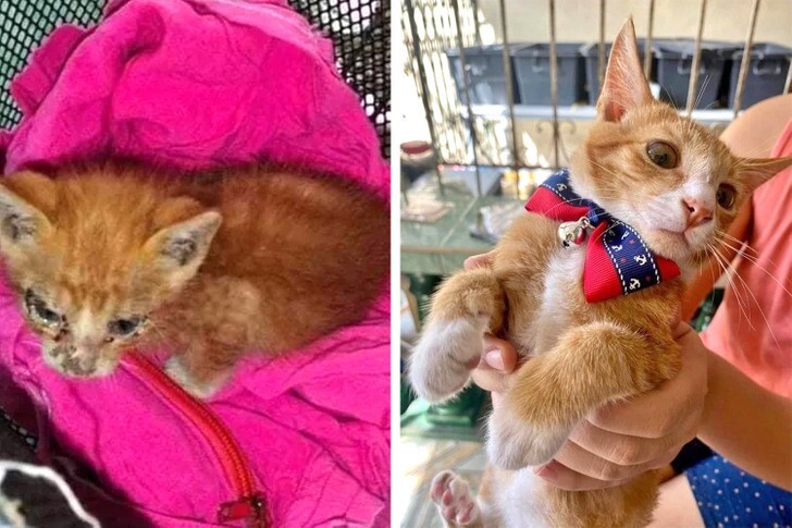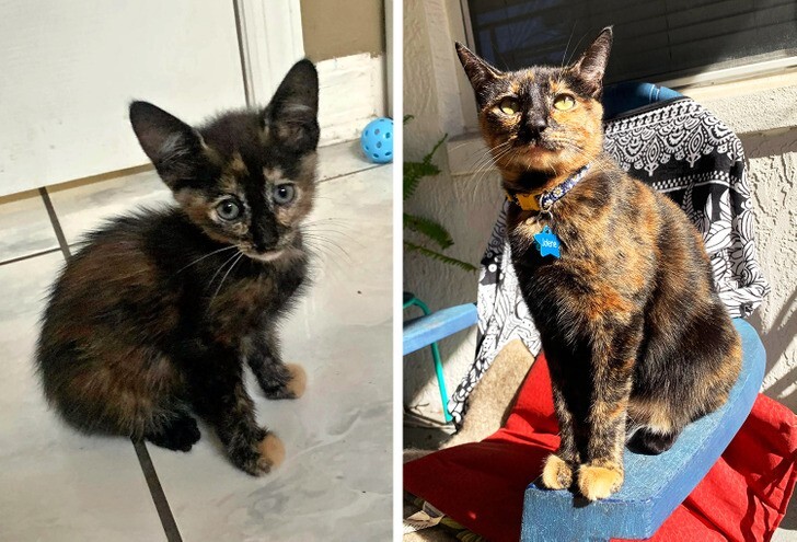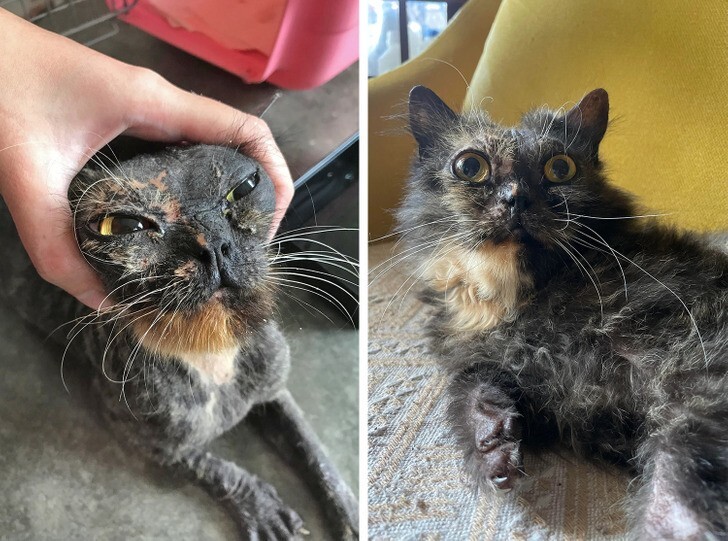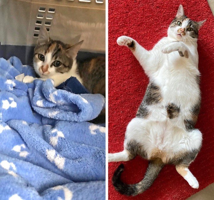 10. У нас появилась Реми пять месяцев назад. Помимо недоедания, у нее был стригущий лишай, из-за которого выпала почти вся шерсть. Теперь она счастливая кошка