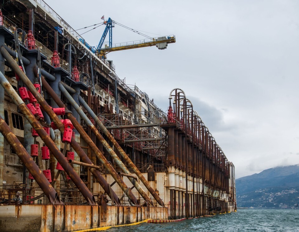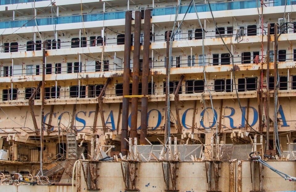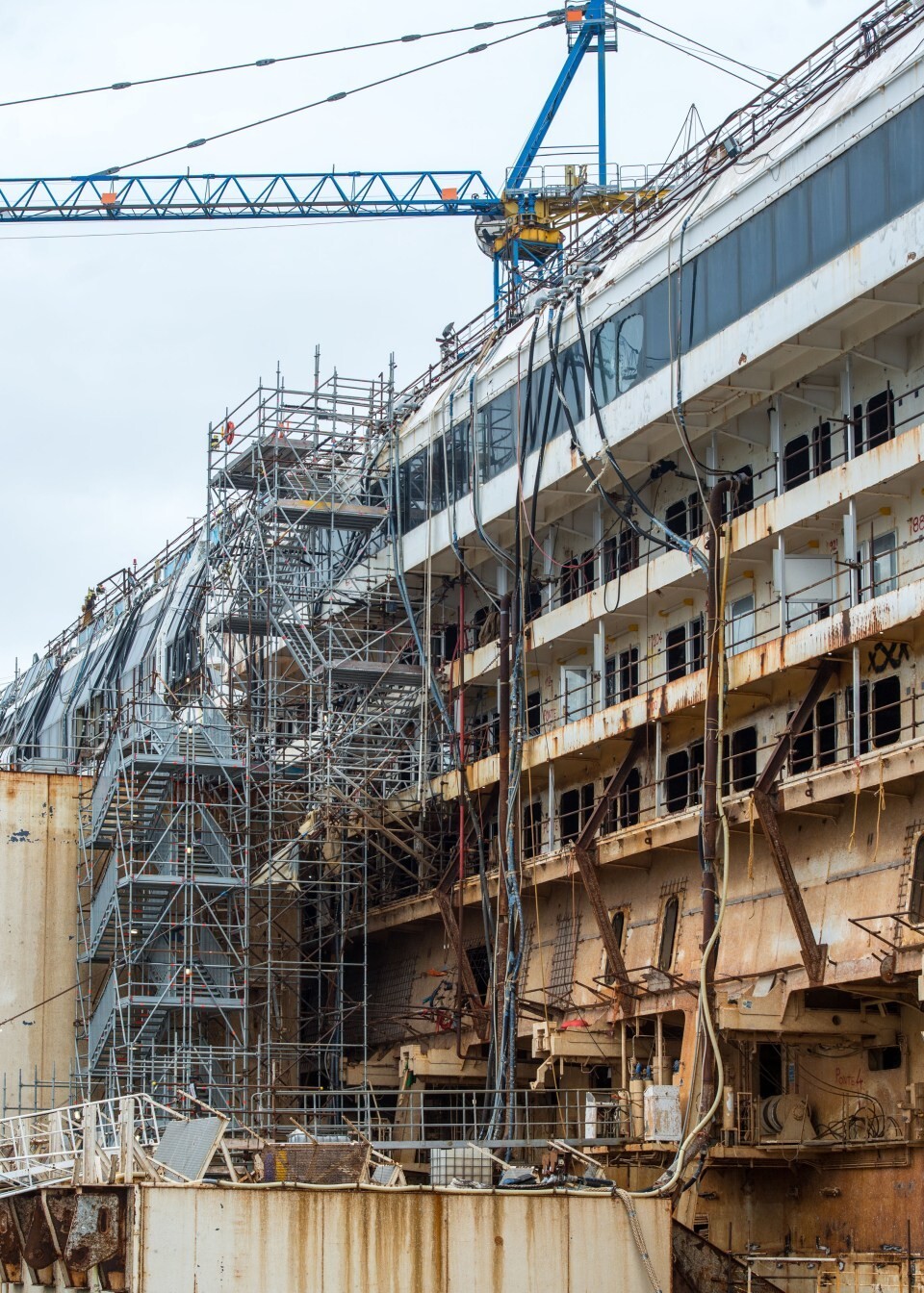 "Коста Конкордия" — самое большое затонувшее пассажирское судно в истории. Оно потерпело крушение в ночь с 13 на 14 января 2012 года, в результате чего погибли 33 человека. Недавно в сети появились фото некогда роскошного судна, на которых его разбирают на металлолом.