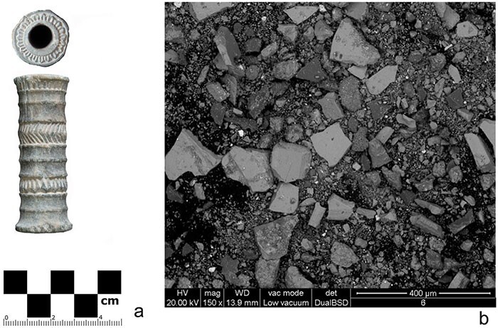 Небольшой цилиндрический пузырёк был обнаружен среди множества ценных артефактов из камня и меди.