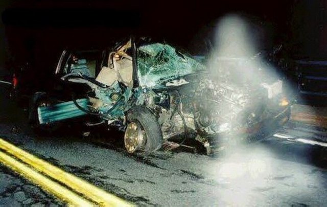 Очевидно, что снимок был сделан практически сразу после жёсткой аварии. Нет информации о том, кто делал снимок, однако в Интернете он набрал свою популярность. Да, здесь видно какую-то белую фигуру. Призрак ли это? Вряд ли. Хотя...
