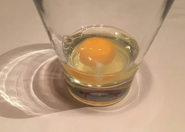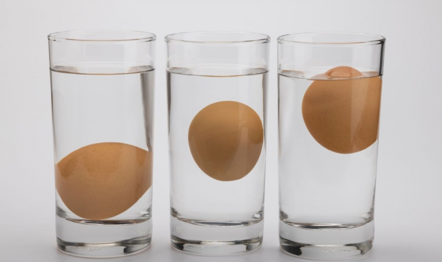 Как проверить свежесть яиц? Если не по запаху, то с помощью воды — если вы бросите в стакан с водой свежее яйцо, оно опустится на дно и ляжет на бок. Если яйцу неделька, то оно будет всплывать тупым концом вверх. А вот если продукт полностью всплывает на поверхность, то есть его точно не нужно — оно испорчено.