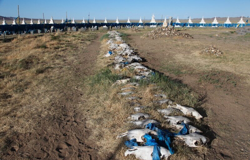 Интересно, что это новомодная современная фишка, и каких-то известных древних кладбищ вип-лошадей в Монголии нет никаких сведений. Хотя сам ритуал похорон скакуна существует много веков. Просто обычно лошадей хоронили, как и людей, просто в степи под горкой из камней.