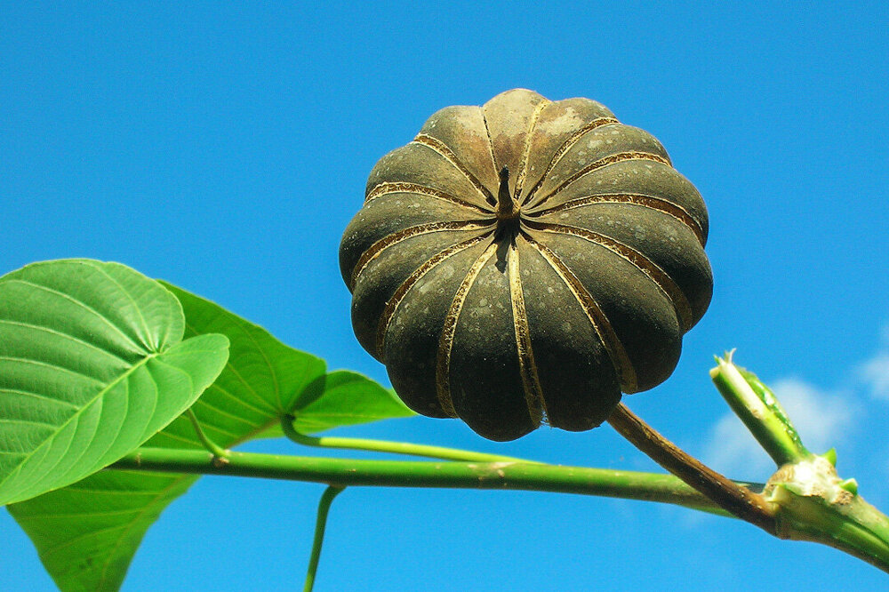 Когда плоды вызревают, "тыковка" летит вниз (с высоты примерно тридцати метров) и с оглушительным, похожим на выстрел из пистолета, треском лопается. А семена, заключённые в "кассеты" (на фото выше) разлетаются во все стороны, способствуя распространению дерева.