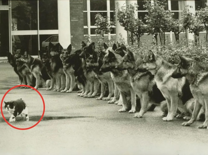 Куча серьёзных здоровых овчарок, перед которыми вальяжно прогуливается кот. Казалось бы, что может пойти не так? Фотография с этой сценой уже пару лет как гуляет по интернету с подписью «Экзамен немецких полицейских собак на выдержку». И ведь люди верят!